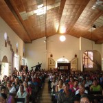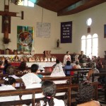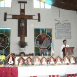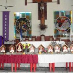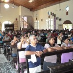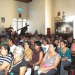 Llegamos a la parroquia Nuestra Señora del Rosario, Departemento de la Paz, Zacatecoluca, El salvador, a la 1:45pm. y para nuestra sorpresa ya habían alrededor de unas 60 personas, una ayudando a disponer las mesas donde colocarían los Oratorios. En 15 minutos, la parroquia se llenó en su totalidad, lo cual nos permitió iniciar el rezo del Santo Rosario, y seguir se hizo una meditación sobre los Misterios del santo rosario.